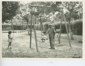 תמונה מס' 3: התצלום מתוך ארכיון בית הראשונים. קלסר מס' 68. שנה לא ידועה. צלם: פוטו ארצי. האיש במרכז התמונה הוא משה פיינברג, האופה שהיתה לו מאפיה בחצר ביתו בכרכור. הילדה הקטנה על הנדנדה היא כנראה נכדתו, נטע פיינברג. הנערה ברקע היא דינה (אז: דיין) כוכבי. מאחורי הספסל, מוסתרת על-ידי גזע עץ, ניצבת אבן ועליה לוח עם שם התורמים של מתקני הגן. מזהים בתמונה עץ בוהיניה.[7]